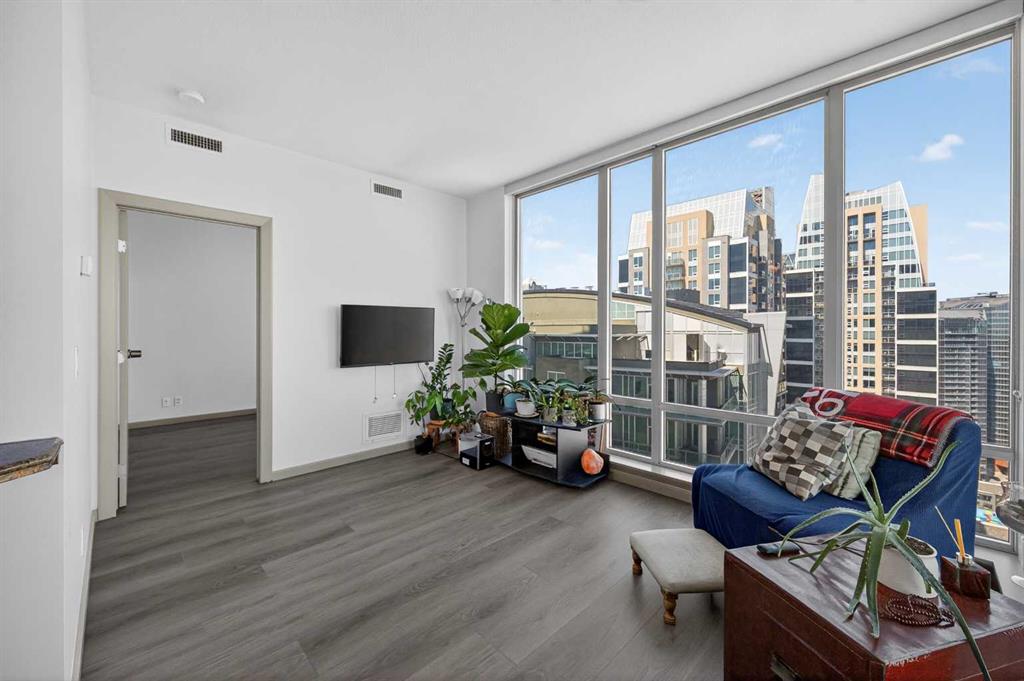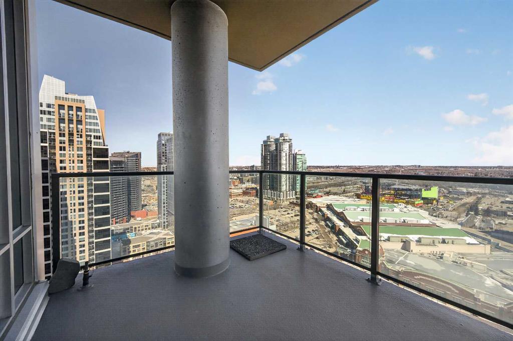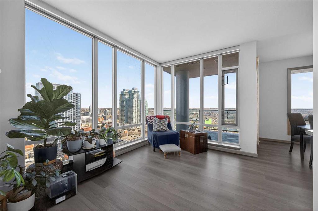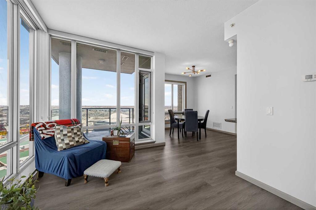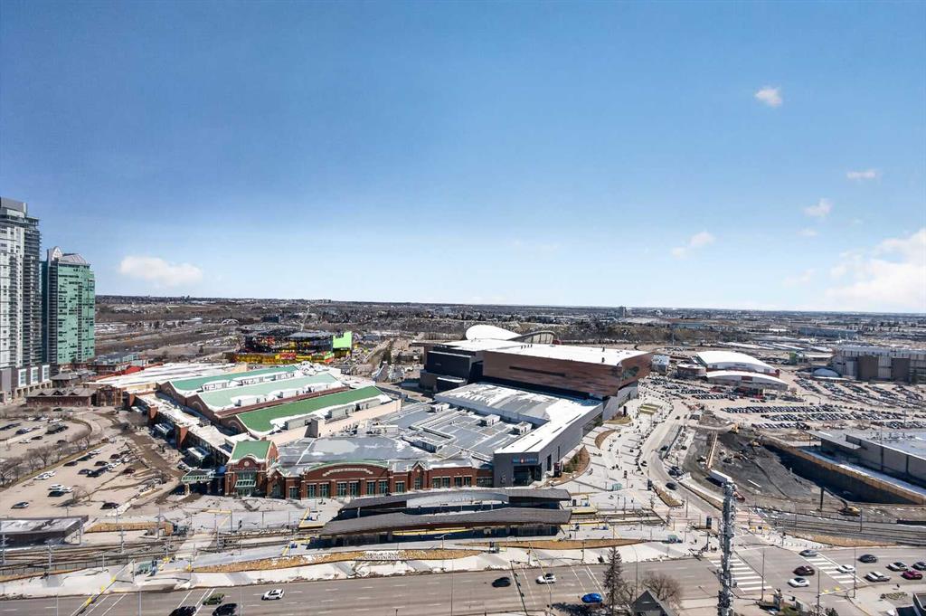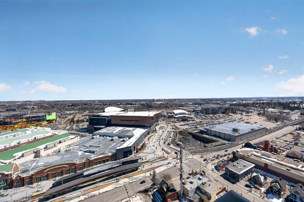 Experience elevated urban living in this exceptional corner unit, featuring a rare wrap-around glass balcony with unobstructed east and south-facing city views. Flooded with natural light throughout the day, this stunning outdoor space also offers a front-row seat to seasonal fireworks—perfect for both relaxing evenings and vibrant entertaining. Inside, the thoughtfully designed open-concept layout is enhanced by 9-foot ceilings and expansive windows, creating a bright, modern, and airy atmosphere. The contemporary kitchen is equipped with sleek cabinetry, stainless steel appliances, under-cabinet lighting, and ample counter space, seamlessly connecting to the dining and living areas for effortless everyday living. The spacious primary bedroom features a walk-through closet and a private ensuite, while the second bedroom and full bathroom provide versatile options for guests, a home office, or shared living arrangements. Ideally situated in the heart of Victoria Park, this home offers unparalleled convenience. With everyday essentials like Shoppers Drug Mart and dry cleaning services just downstairs, plus a wide array of restaurants, cafés, and entertainment options within walking distance, everything you need is right at your doorstep. Enjoy easy access to 17th Avenue, Stampede Park, the Saddledome, BMO Centre, and the Victoria Park C-Train Station, along with major routes including Deerfoot Trail, Memorial Drive, and Macleod Trail. This well-managed building features premium amenities such as a fitness centre, hot tub, party room, and theatre room. The unit is complete with titled underground parking and additional storage, adding both comfort and convenience. Whether you’re a first-time buyer, investor, or looking to enjoy the best of downtown living, this is a rare opportunity in one of Calgary’s most dynamic communities.